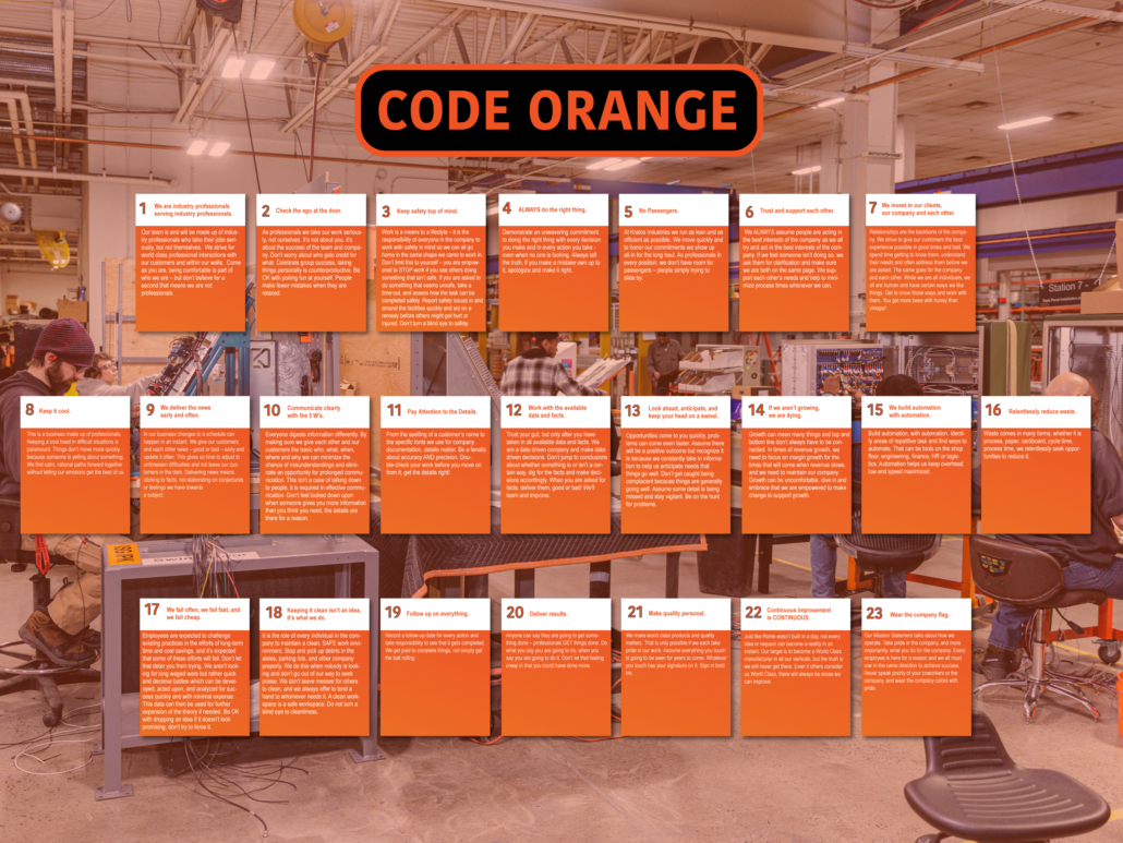 CODE ORANGE, the 23 statements that are the guiding principles of life at Kratos Industries…in poster form. 40″x30″
